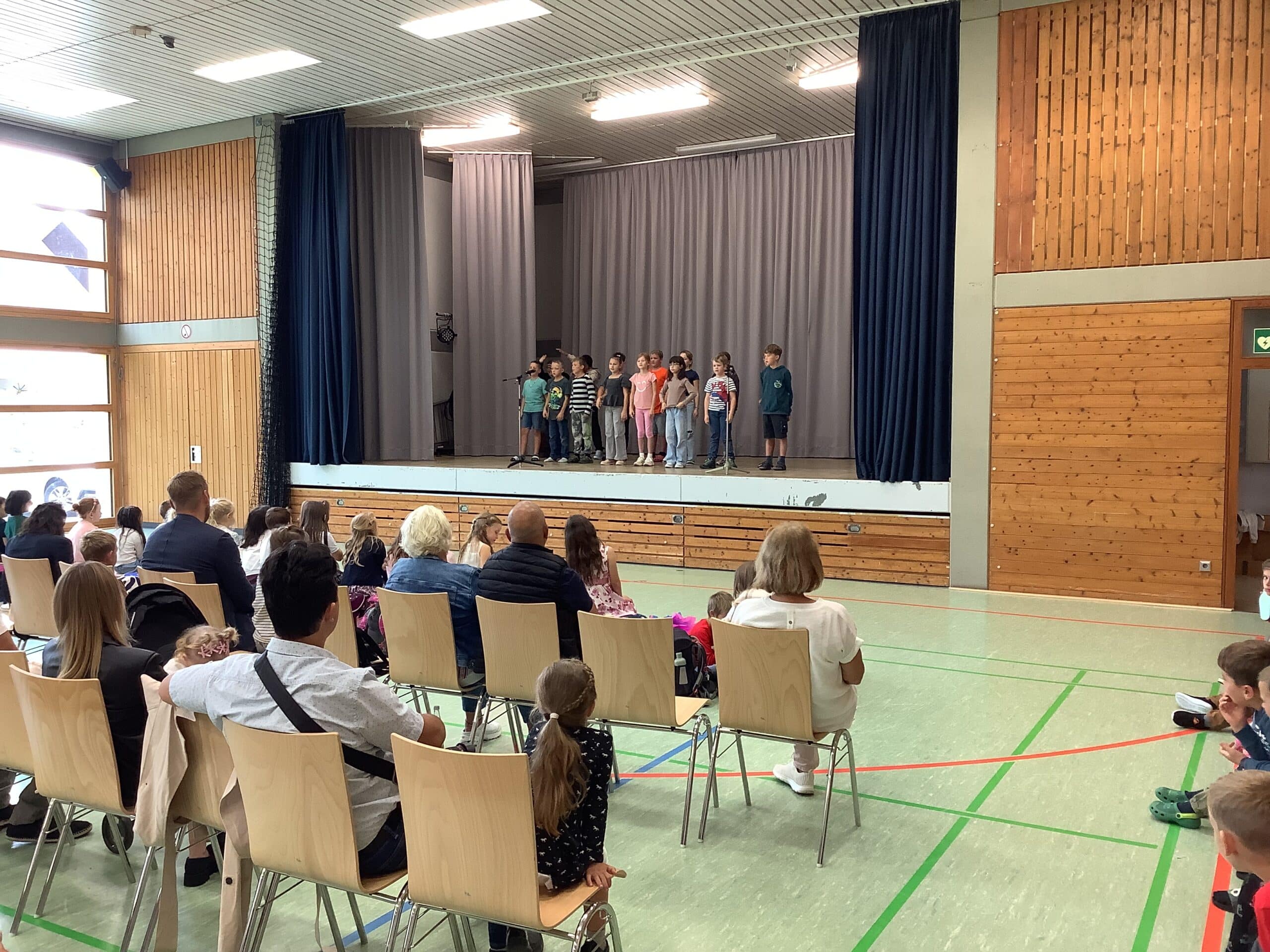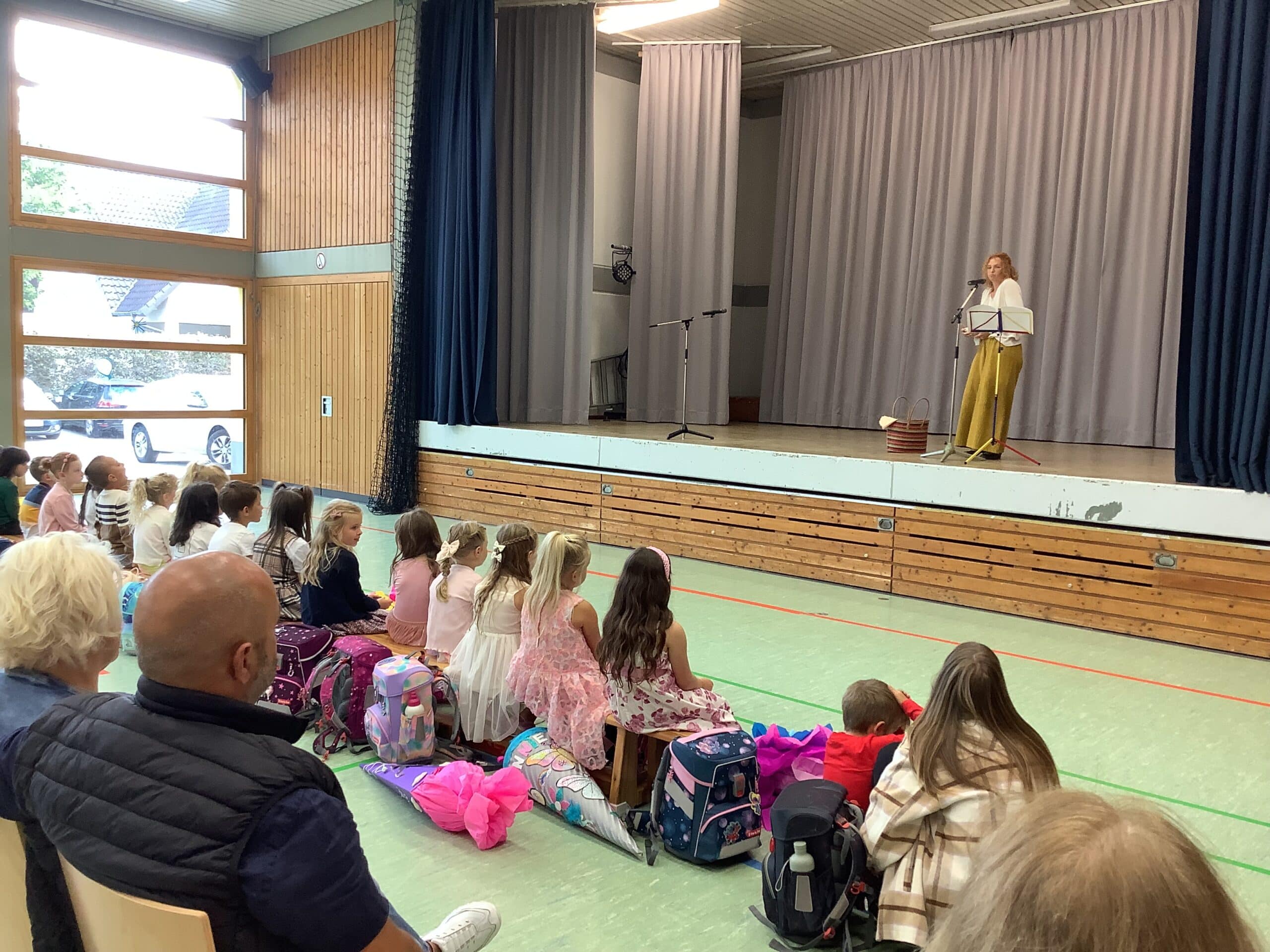 Nach dem festlichen Gottesdienst wurden die neuen Erstklässler*innen von der Klassenlehrerin Frau Nienstedt in ihr Klassenzimmer begleitet. Während sie in ihre erste Schulstunde starteten, hatten die Eltern die Gelegenheit, sich bei selbstgebackenem Kuchen der Klasse 4c und erfrischenden Getränken auszutauschen und neue Bekanntschaften zu schließen. Zu Beginn des Programms hieß Frau Fischer die Kinder offiziell in unserer Schulgemeinschaft herzlich willkommen. Anschließend wurde das Programm von den kreativen Klassen 2c und 4c, die mit tollen Darbietungen und musikalischen Einlagen für gute Stimmung sorgten, gestaltet.